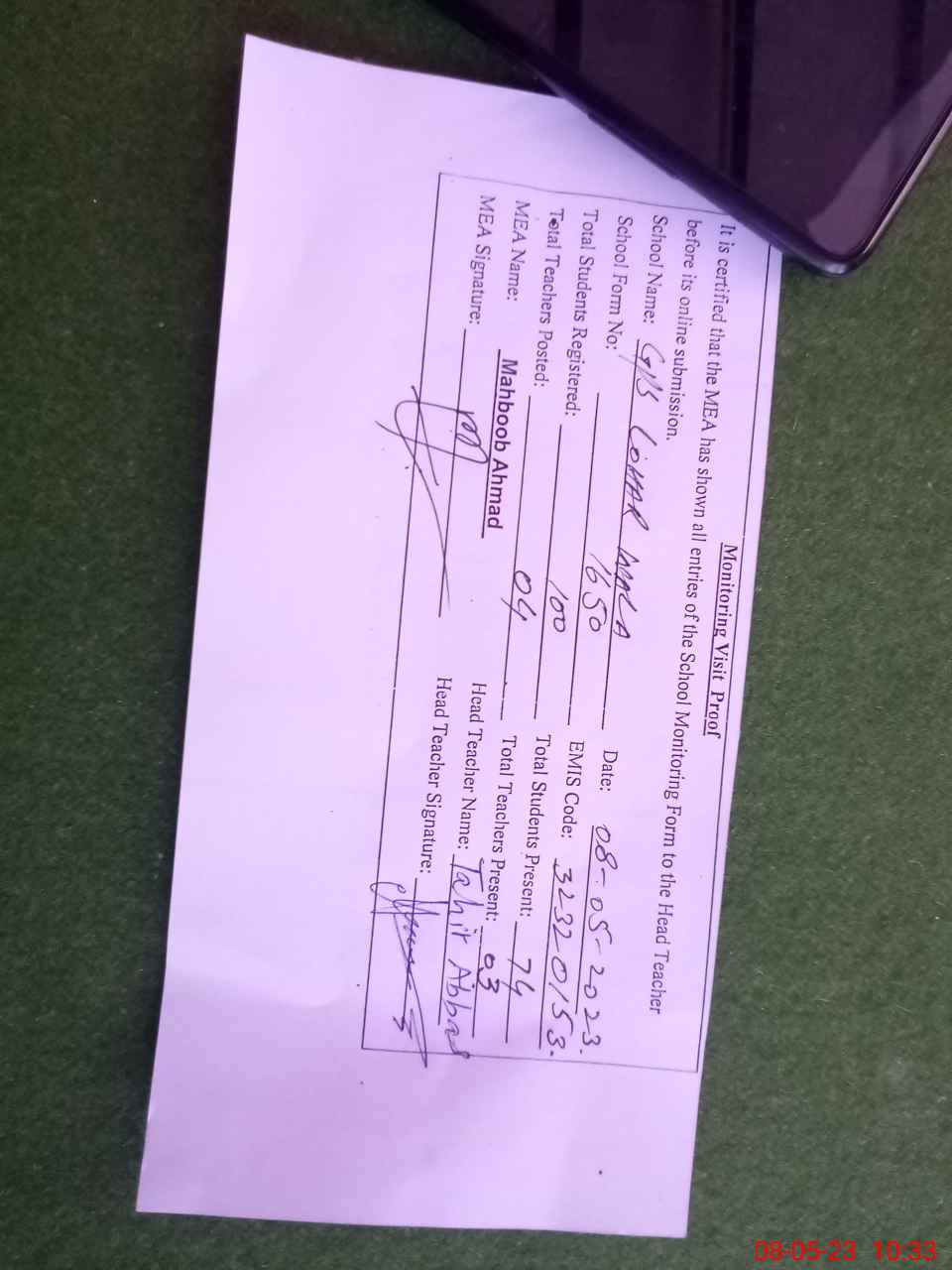 | Attendance Register | Head Teacher | MEA with School | Visit Proof |