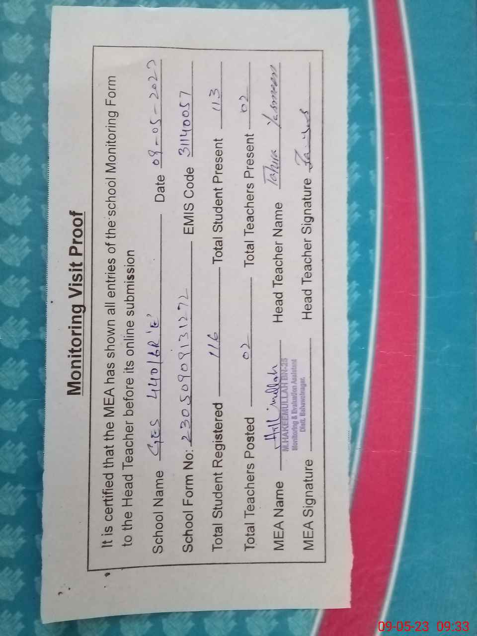 | Attendance Register | Head Teacher | MEA with School | Visit Proof |