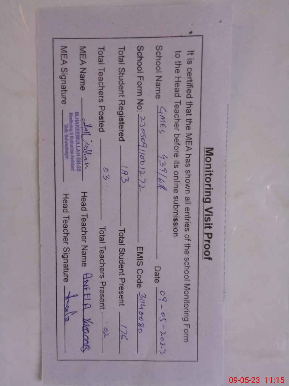 | Attendance Register | Head Teacher | MEA with School | Visit Proof |