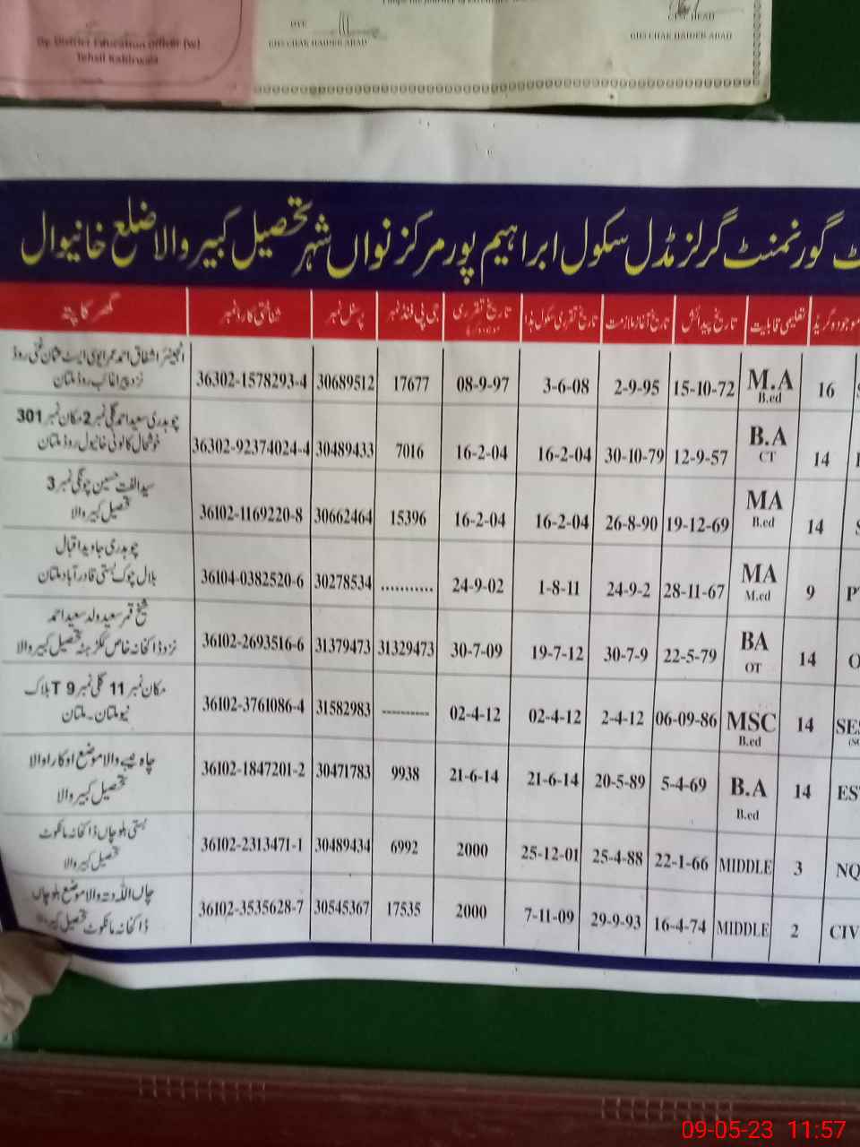 | District: KHANEWAL | Tehsil: KABIRWALA | Markaz: MONGA WALA - FEMALE | Level: Middle | |