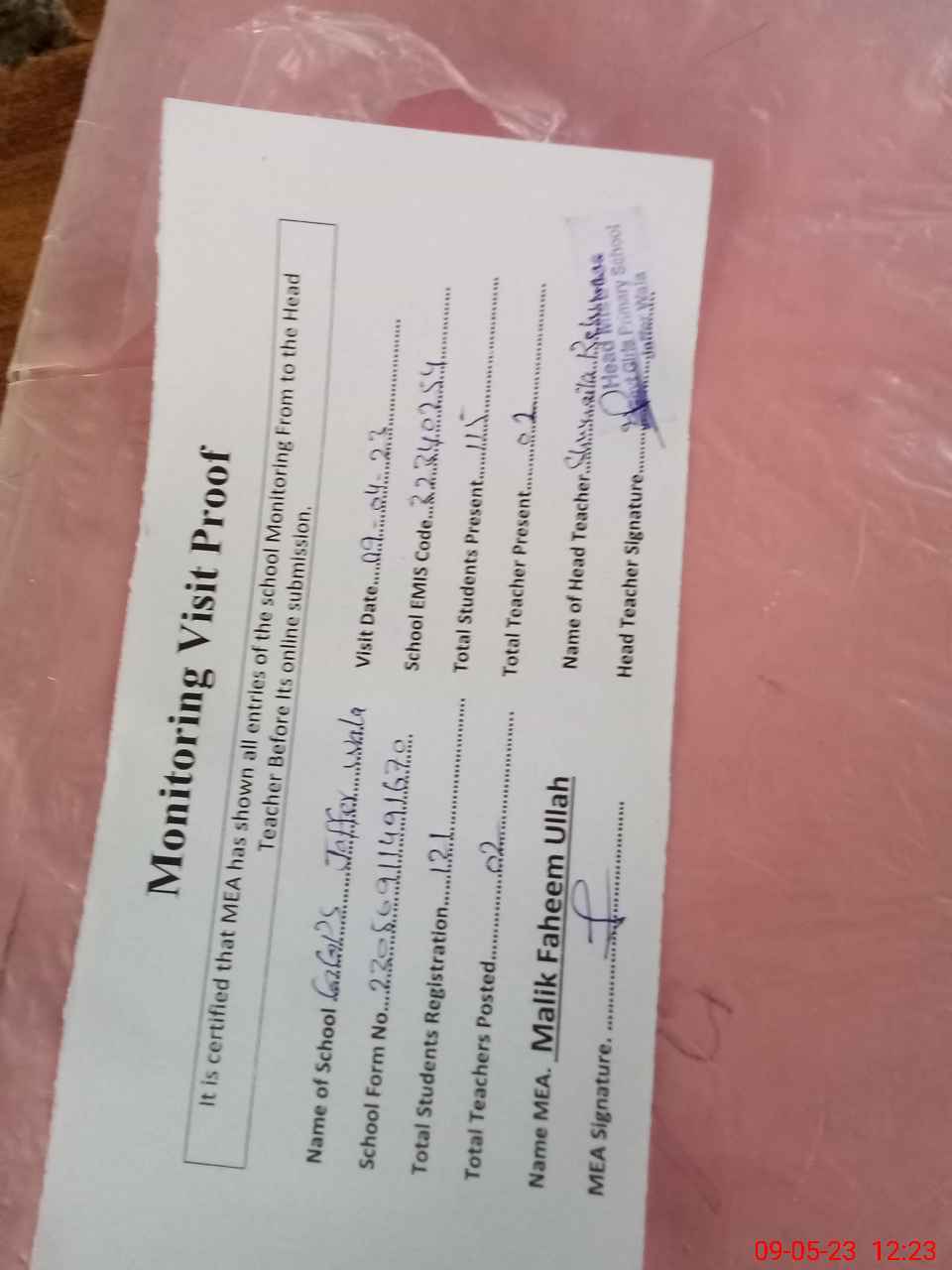 | Attendance Register | Head Teacher | MEA with School | Visit Proof |