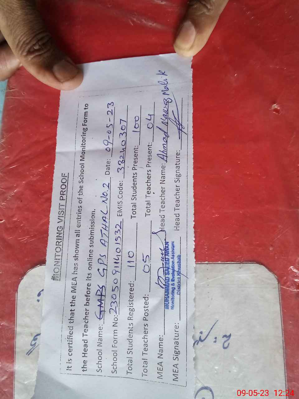 | Attendance Register | Head Teacher | MEA with School | Visit Proof |