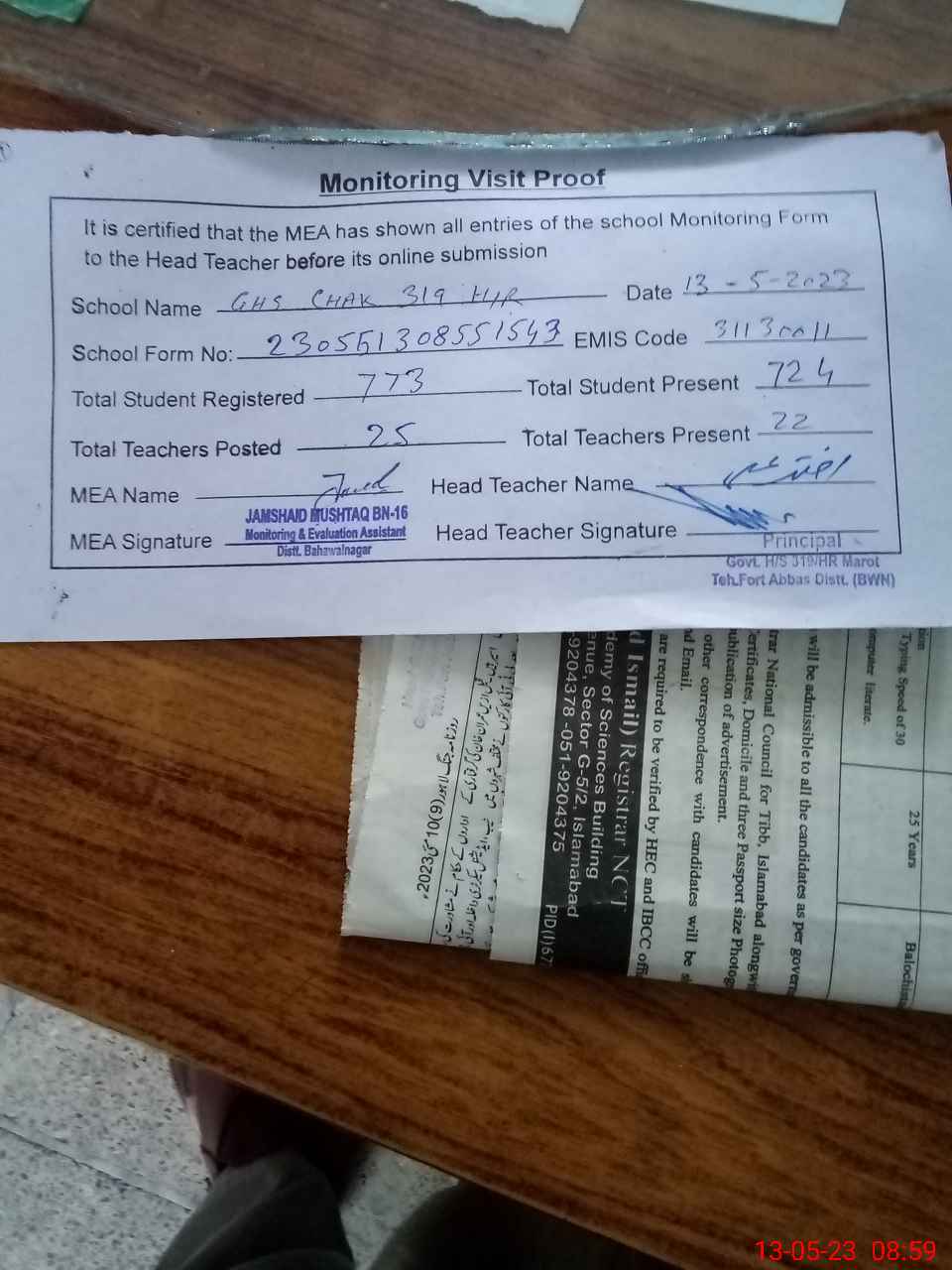| Certified that this School was Inspected by the Undersigned MEA/DMO Today and the Information Stated Above is as Per Record. | |||||