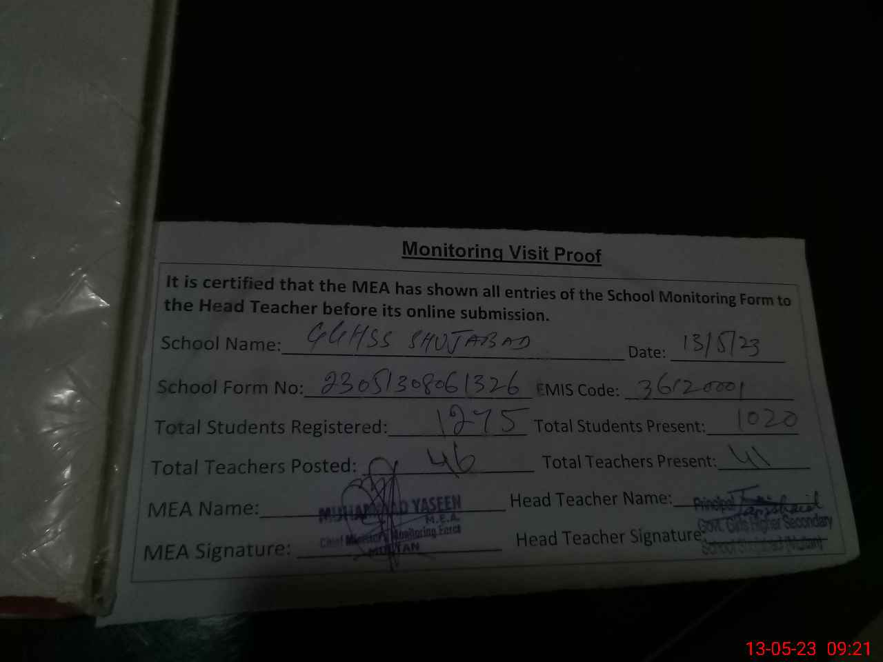 | Attendance Register | Head Teacher | MEA with School | Visit Proof |
