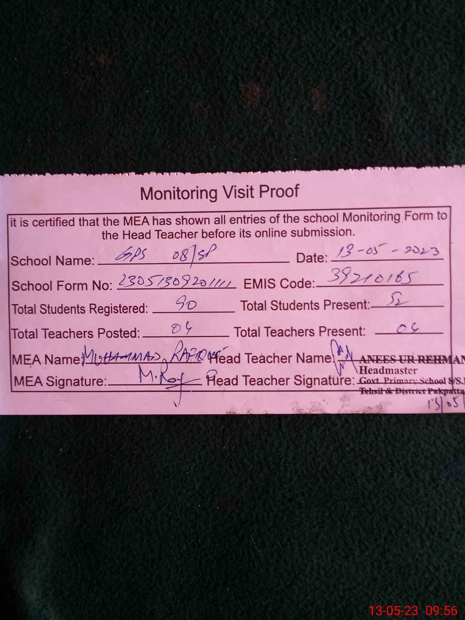 | Attendance Register | Head Teacher | MEA with School | Visit Proof |