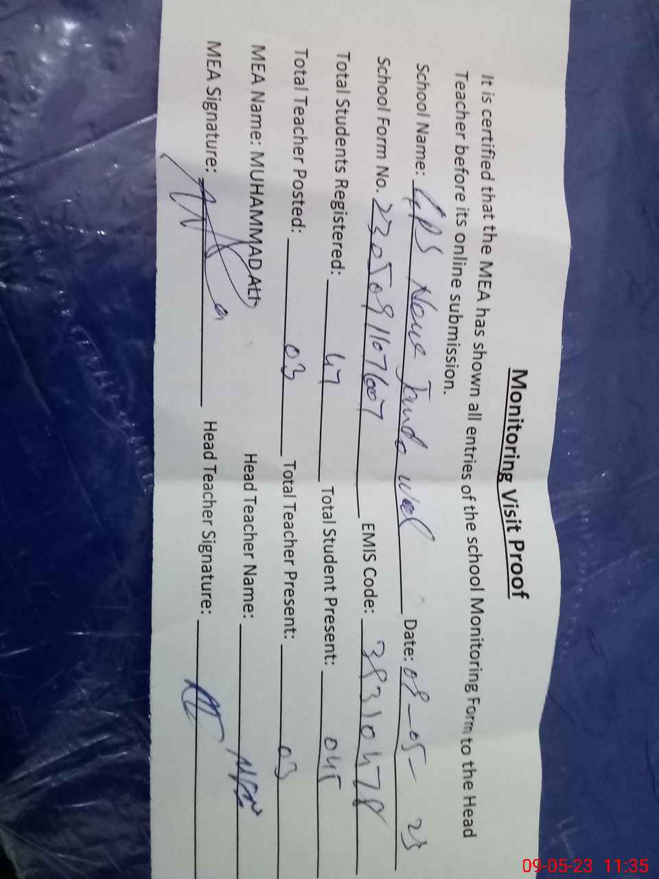 | Attendance Register | Head Teacher | MEA with School | Visit Proof |