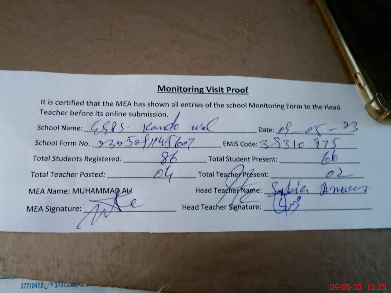 | Attendance Register | Head Teacher | MEA with School | Visit Proof |