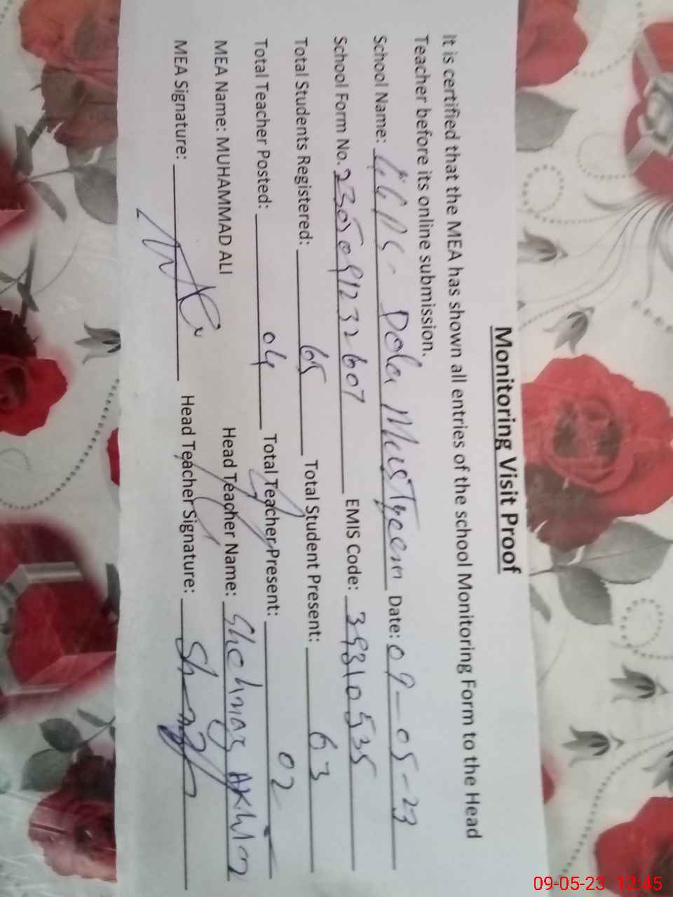 | Attendance Register | Head Teacher | MEA with School | Visit Proof |