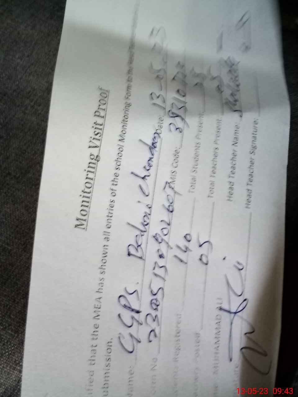| Attendance Register | Head Teacher | MEA with School | Visit Proof |