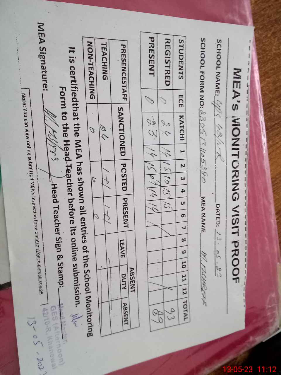 | Attendance Register | Head Teacher | MEA with School | Visit Proof |