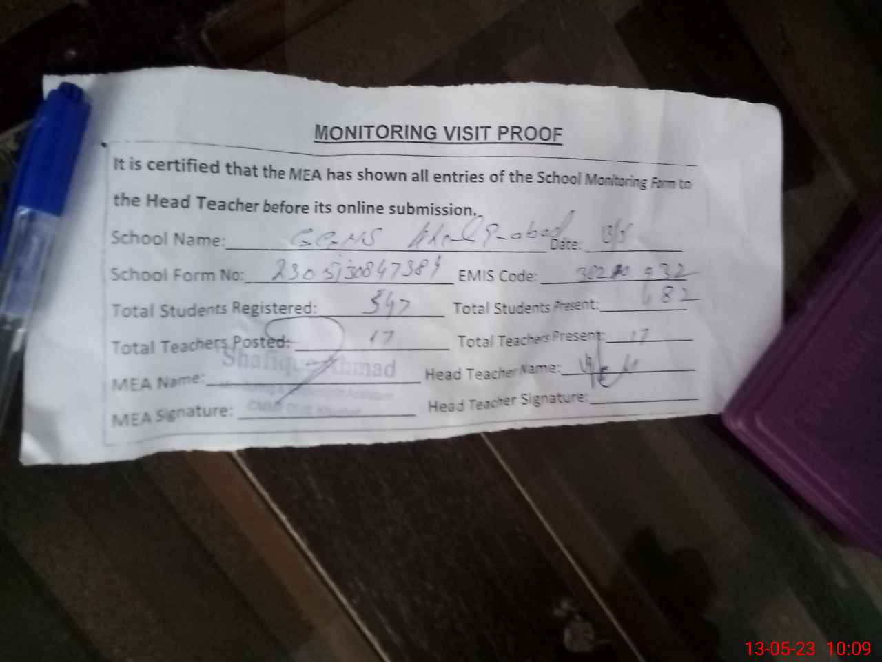 | Attendance Register | Head Teacher | MEA with School | Visit Proof |