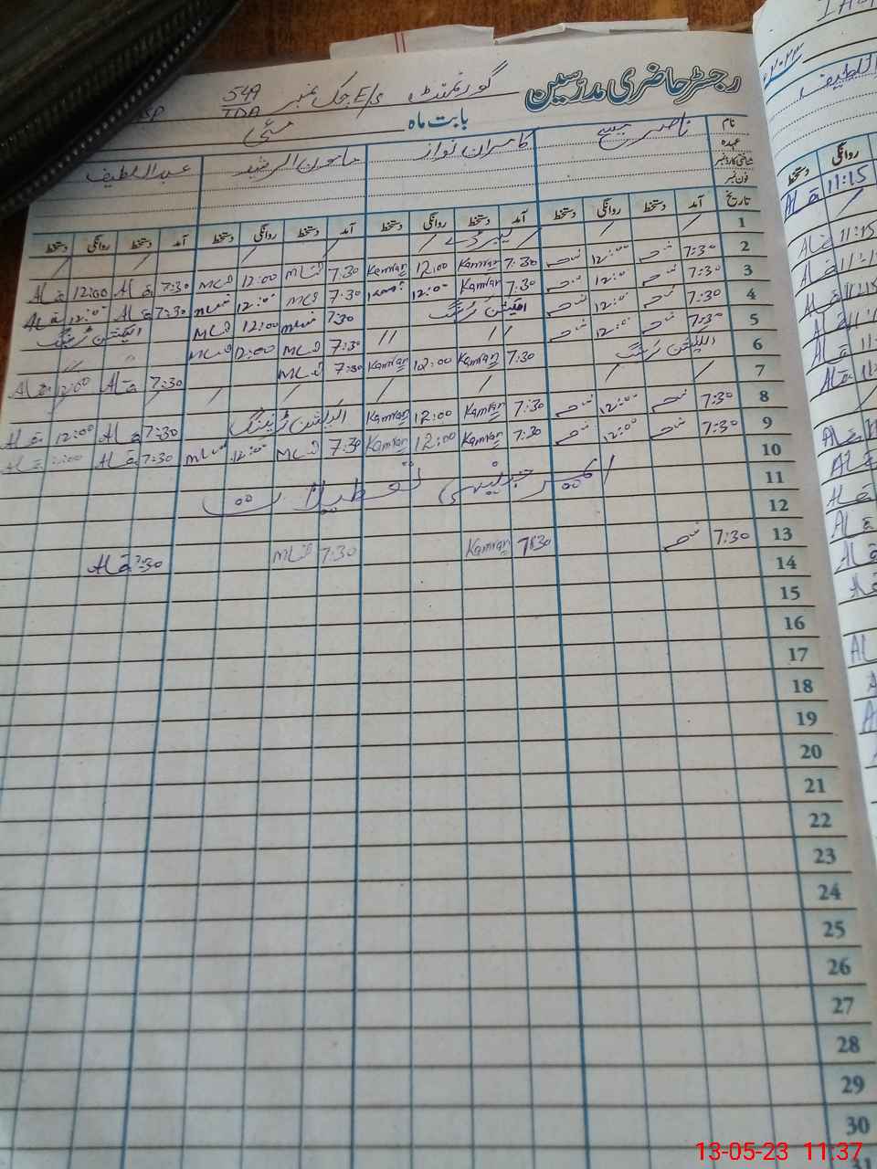 | CNIC | Full Name | Designation | R/C | Absence During Last Calender Month |