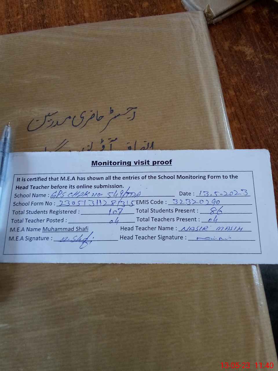| Attendance Register | Head Teacher | MEA with School | Visit Proof |