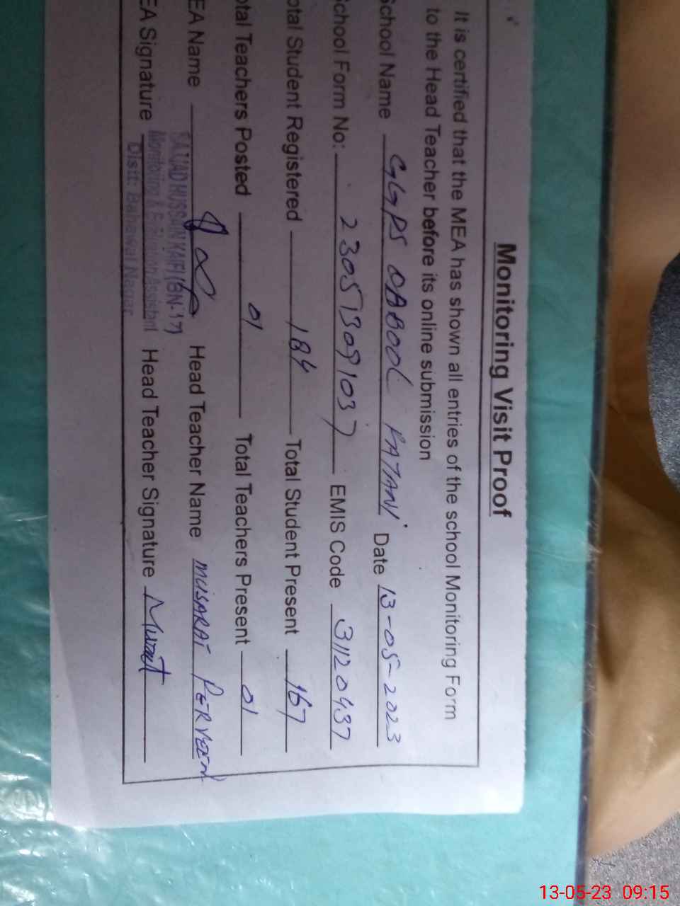 | Attendance Register | Head Teacher | MEA with School | Visit Proof |