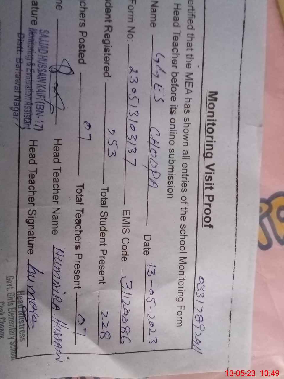 | Attendance Register | Head Teacher | MEA with School | Visit Proof |
