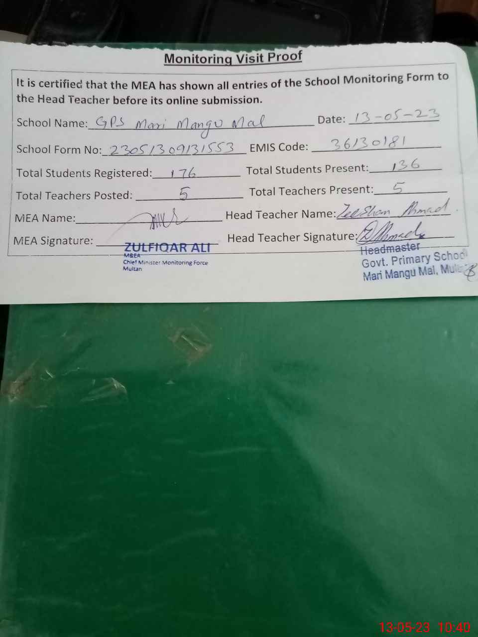 | Attendance Register | Head Teacher | MEA with School | Visit Proof |