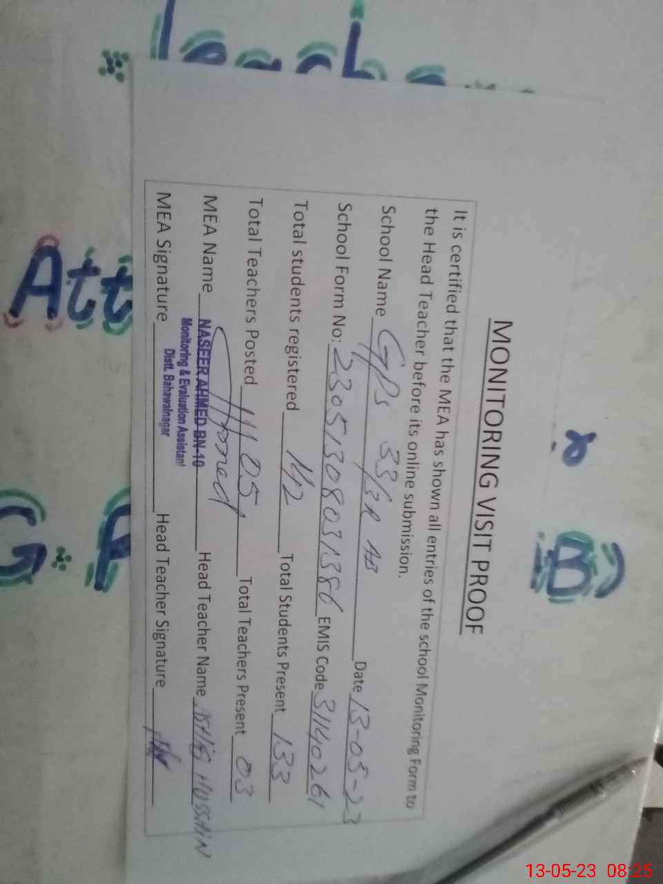 | Attendance Register | Head Teacher | MEA with School | Visit Proof |