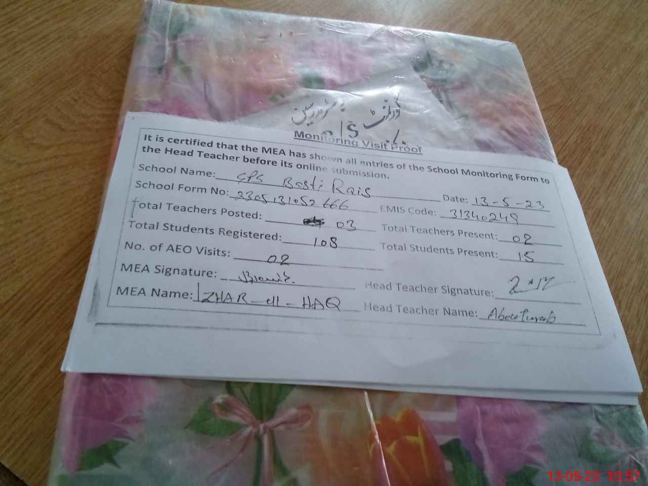 | Attendance Register | Head Teacher | MEA with School | Visit Proof |