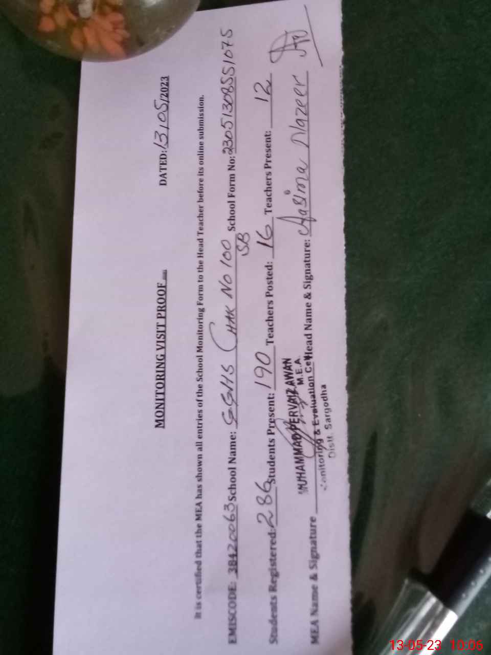 | Attendance Register | Head Teacher | MEA with School | Visit Proof |
