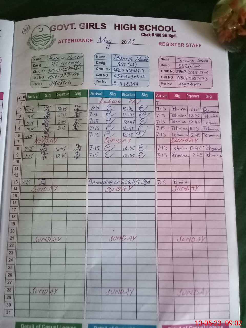 | CNIC | Full Name | Designation | R/C | Absence During Last Calender Month |
