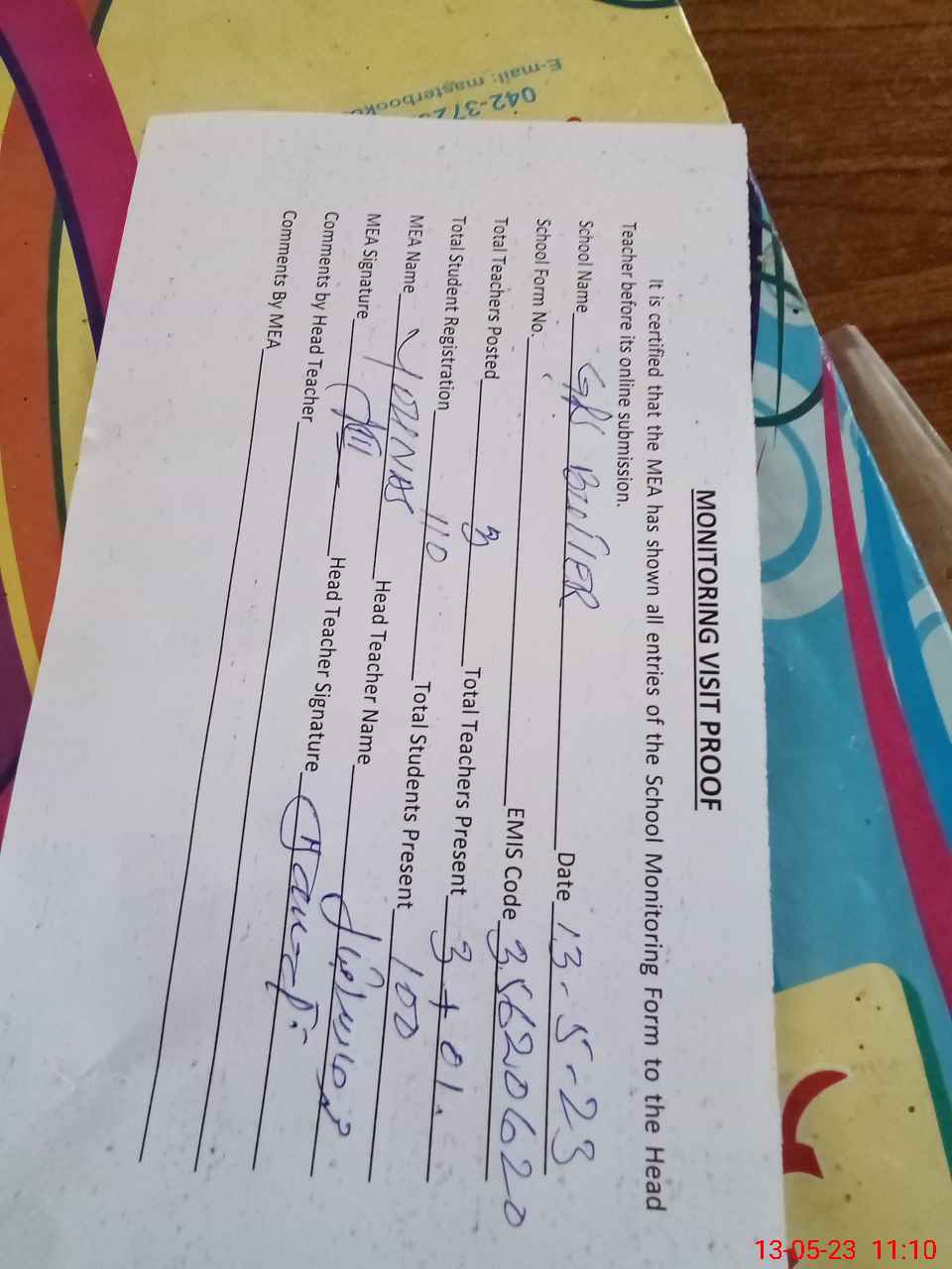 | Attendance Register | Head Teacher | MEA with School | Visit Proof |