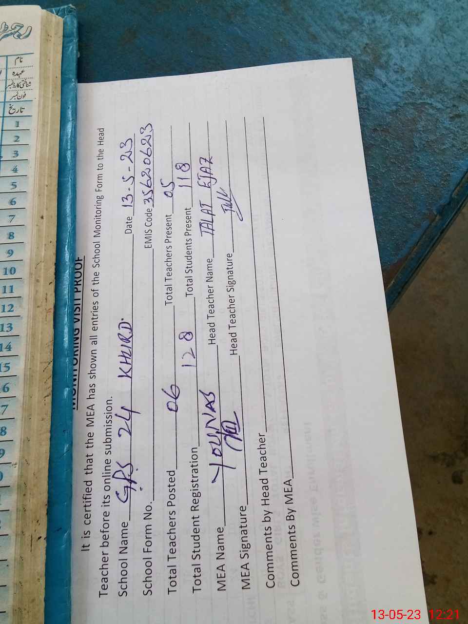 | Attendance Register | Head Teacher | MEA with School | Visit Proof |