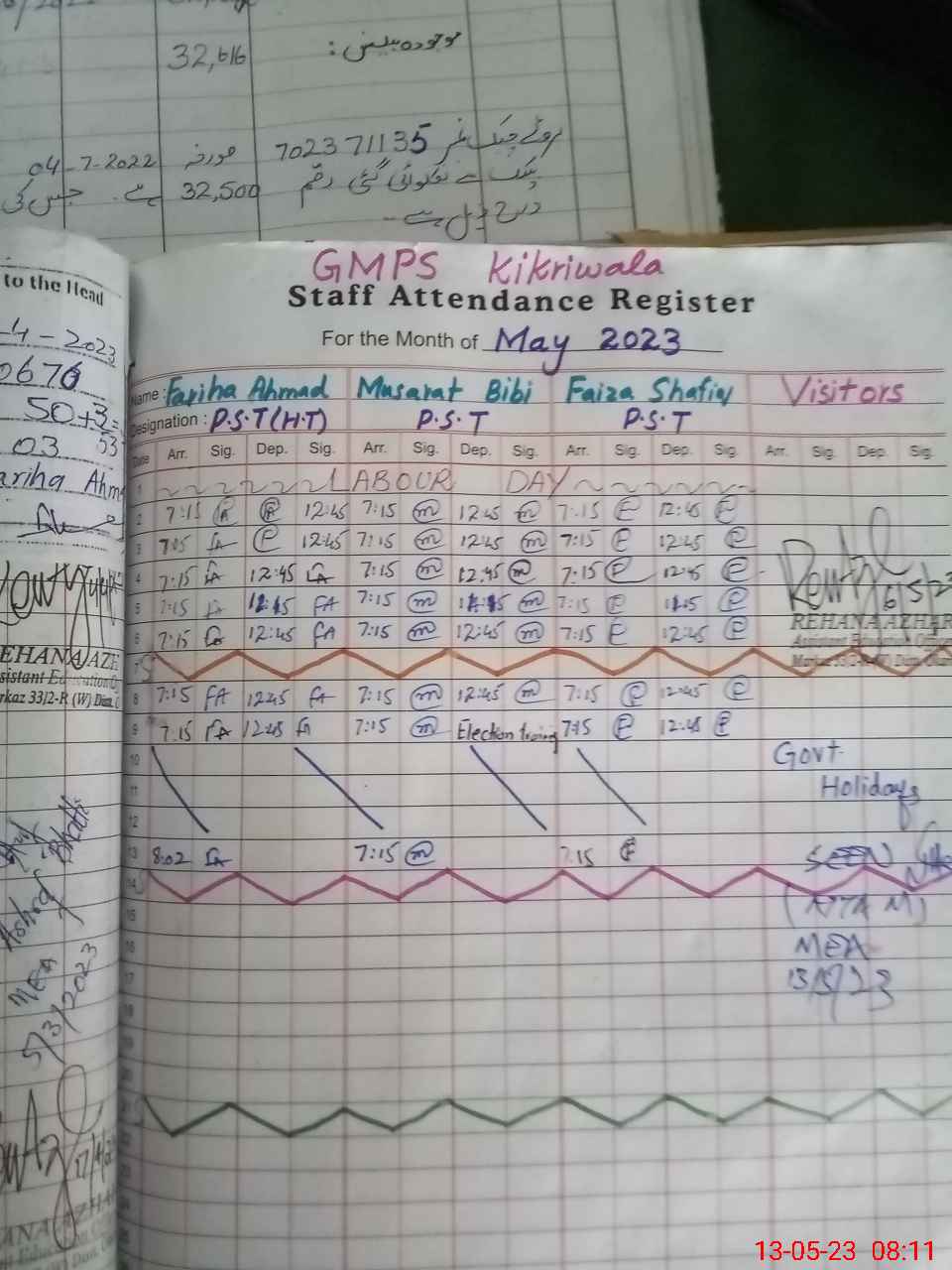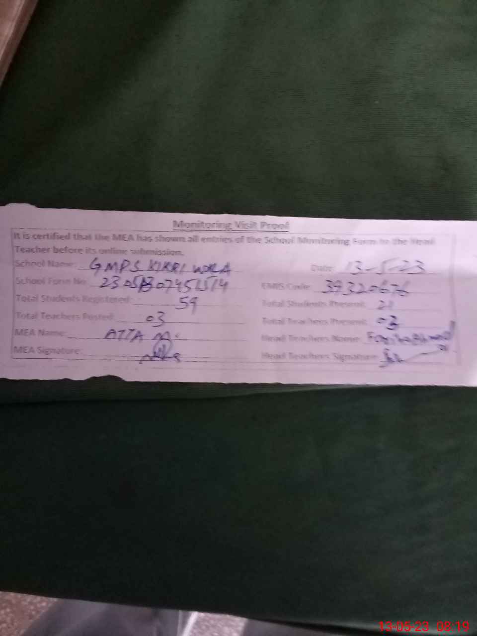 | Attendance Register | Head Teacher | MEA with School | Visit Proof |