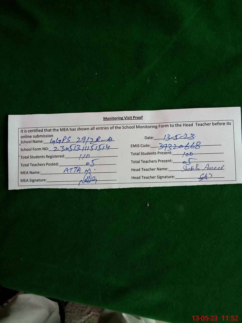 | Name: SH**** AM**** Designation: (School Headmaster's/Headmistress's) PST Phone/Cell Number: 03**** |