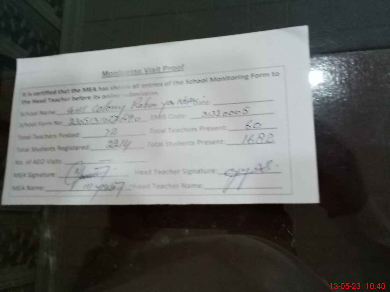 | Attendance Register | Head Teacher | MEA with School | Visit Proof |