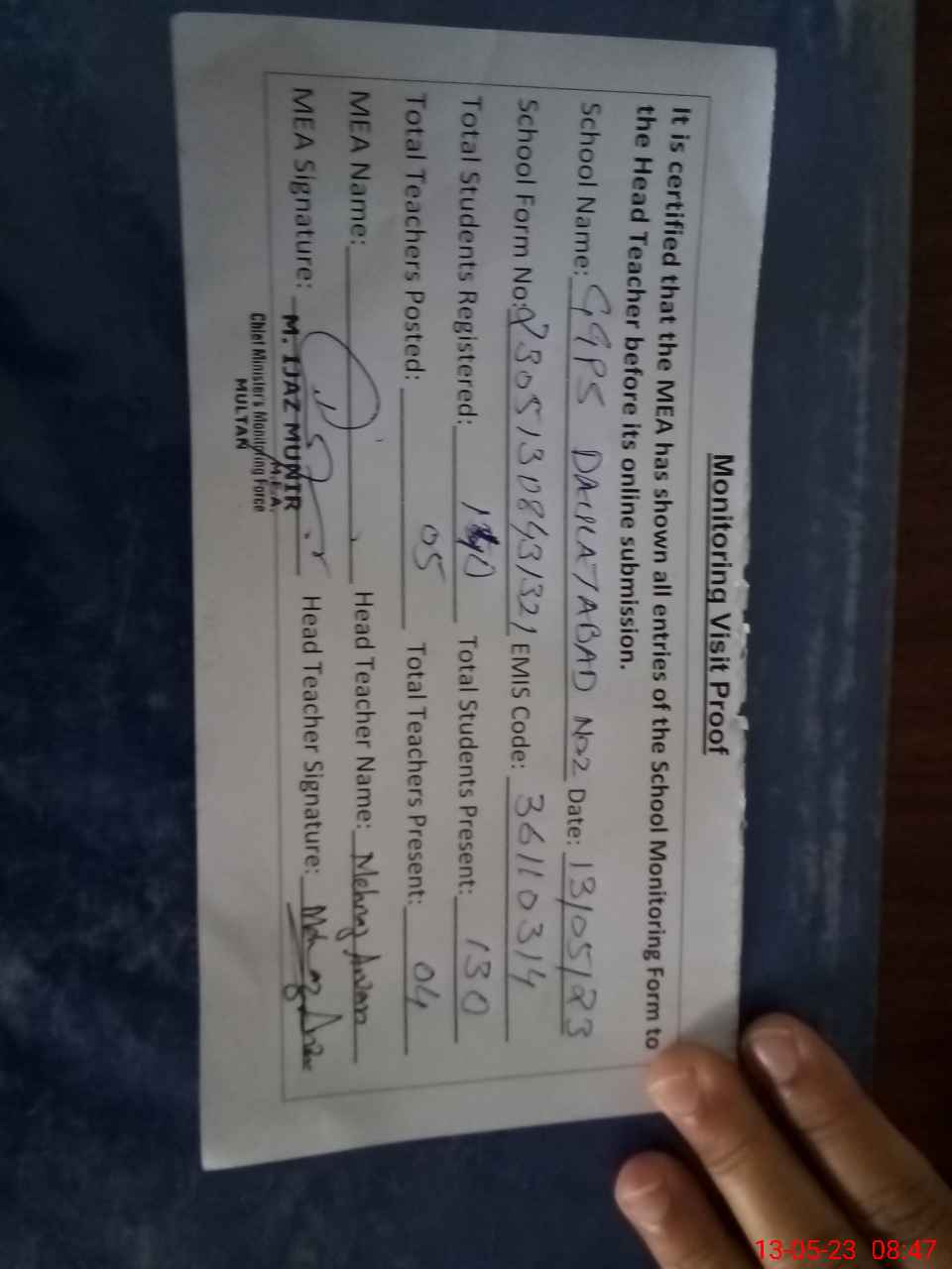 | Attendance Register | Head Teacher | MEA with School | Visit Proof |