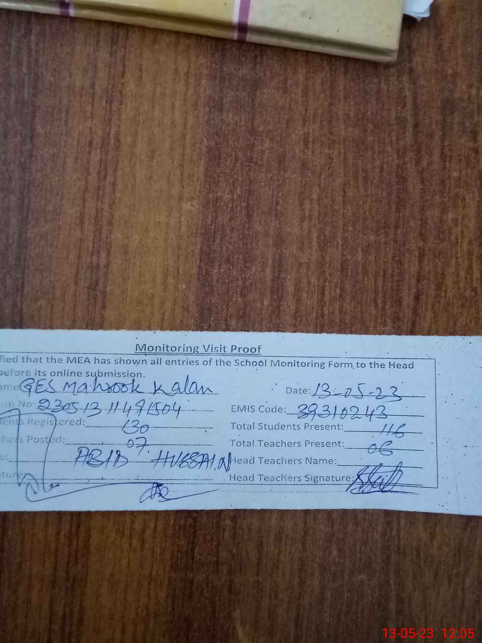 | Attendance Register | Head Teacher | MEA with School | Visit Proof |