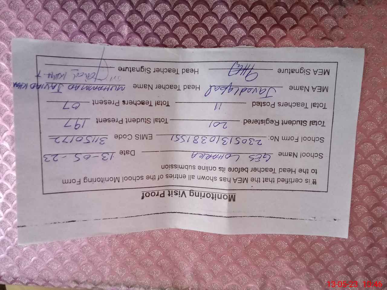 | Certified that this School was Inspected by the Undersigned MEA/DMO Today and the Information Stated Above is as Per Record. | |||||