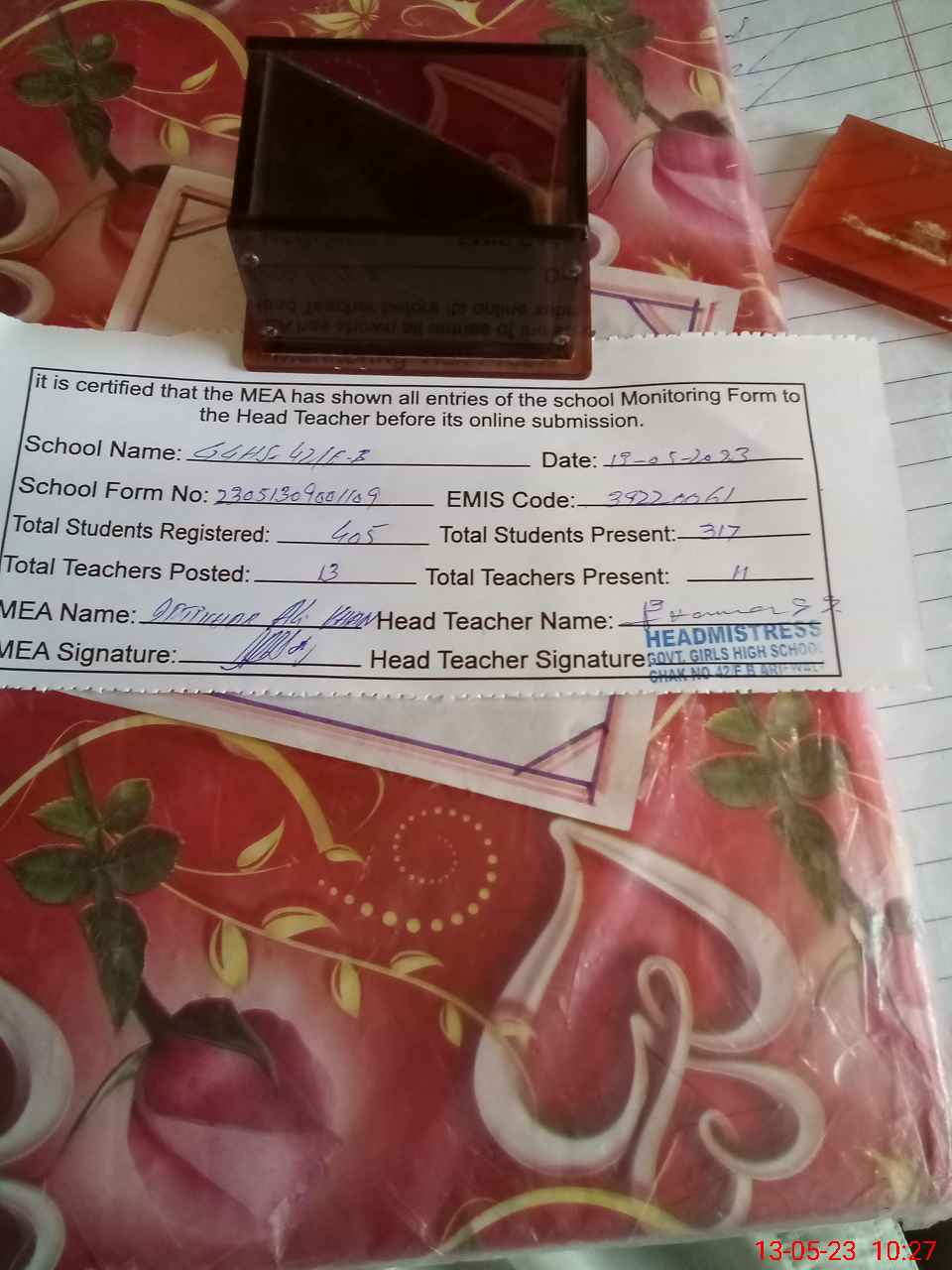 | Certified that this School was Inspected by the Undersigned MEA/DMO Today and the Information Stated Above is as Per Record. | |||||