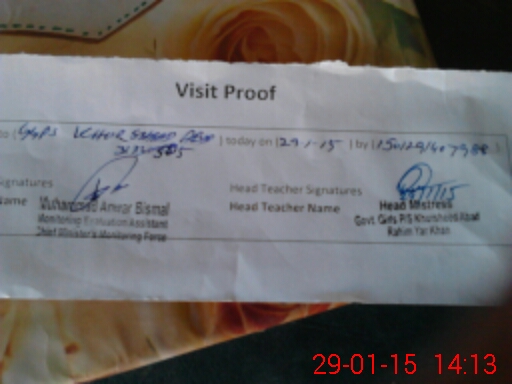 | School Visited by School Health & Nutrition Supervisor (No. of Visits) | 1 | Name1: | IFTIKHAR AHMED | Name2: | |