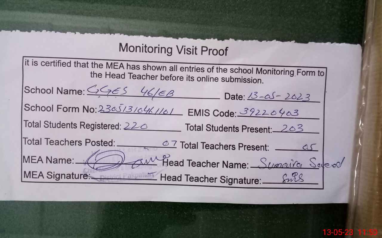 | Certified that this School was Inspected by the Undersigned MEA/DMO Today and the Information Stated Above is as Per Record. | |||||