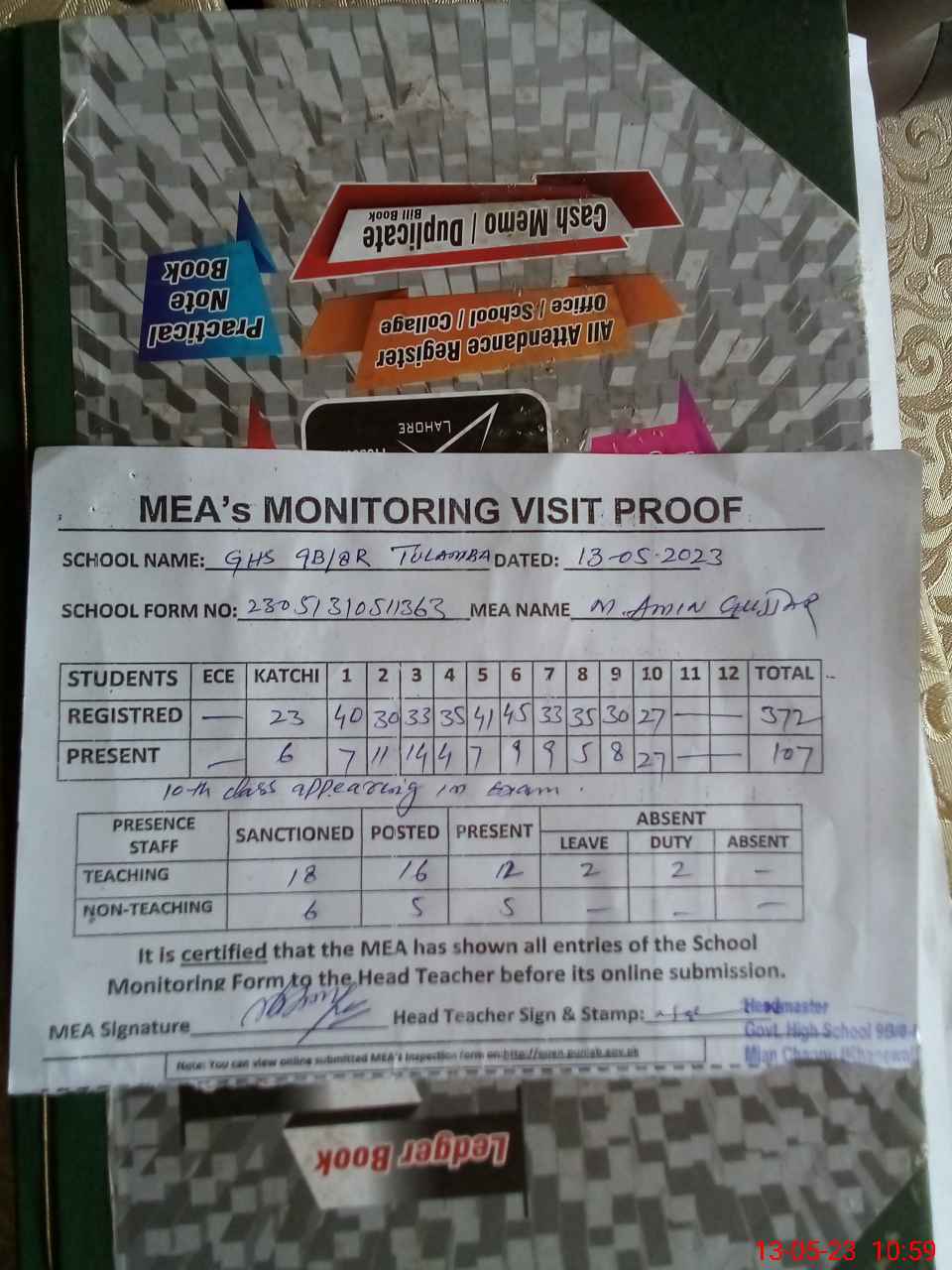 | Attendance Register | Head Teacher | MEA with School | Visit Proof |