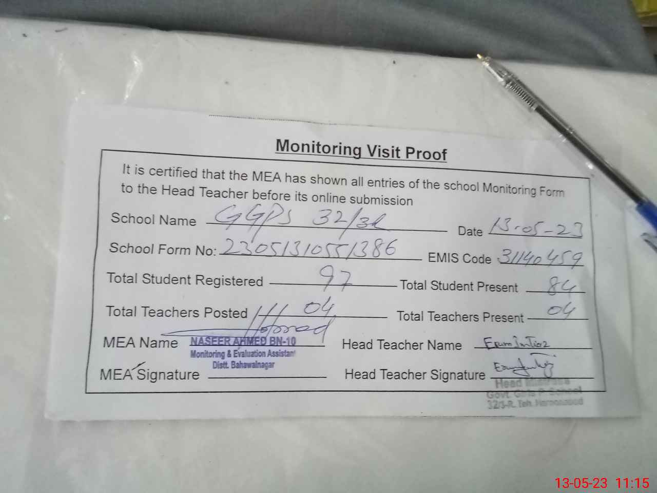 | Attendance Register | Head Teacher | MEA with School | Visit Proof |