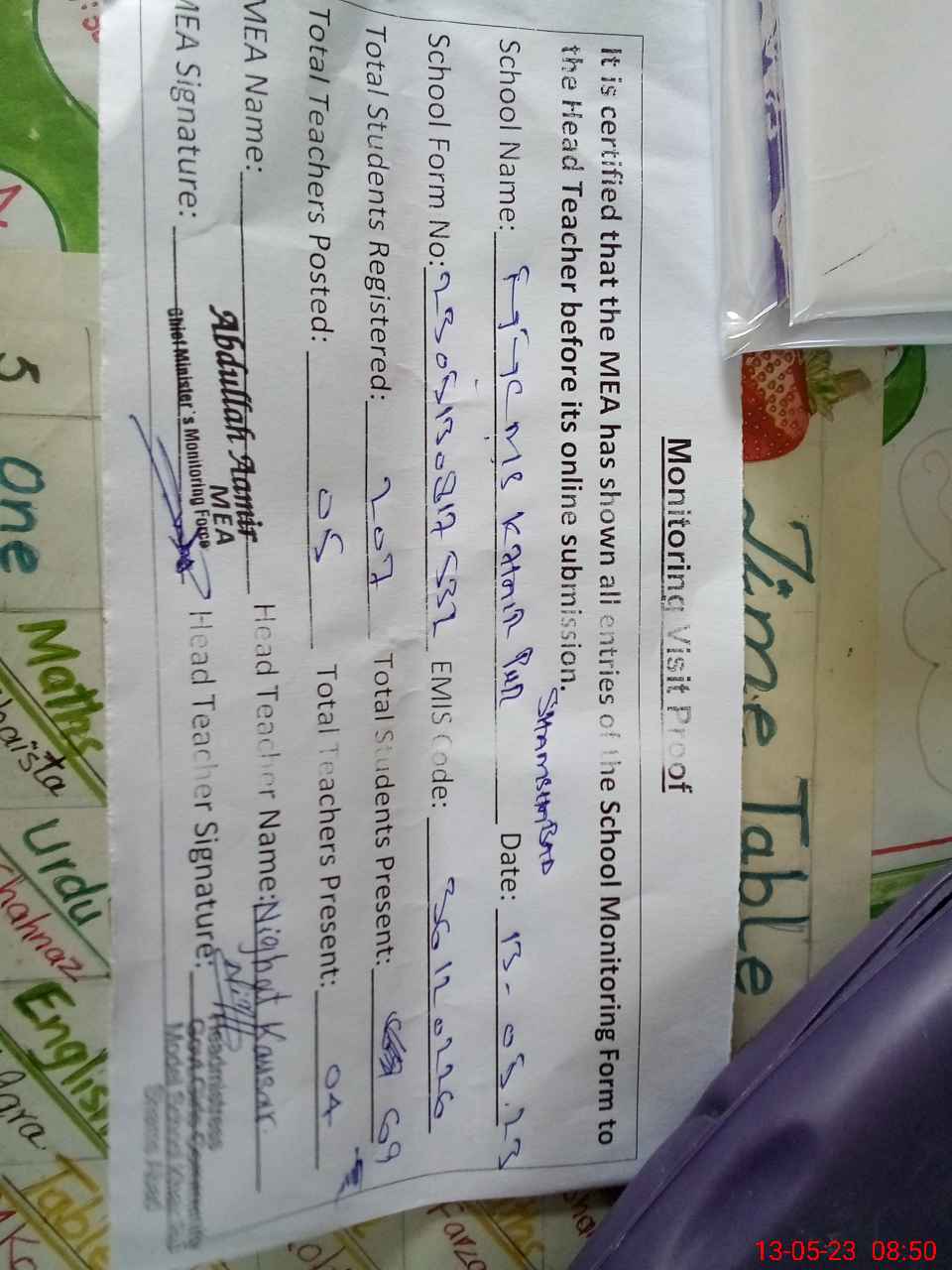 | Attendance Register | Head Teacher | MEA with School | Visit Proof |