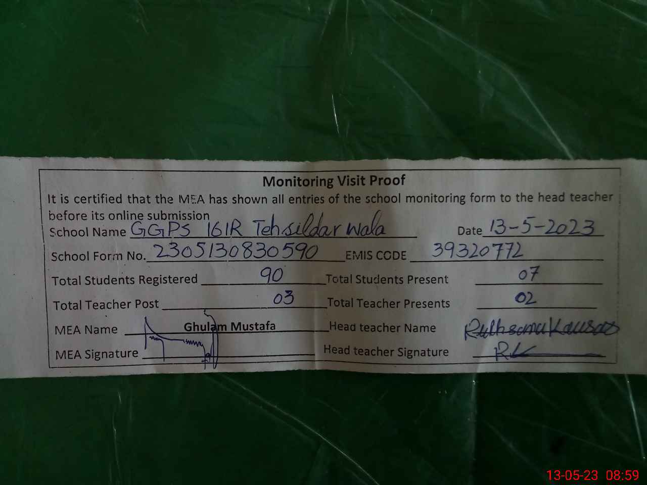 | Attendance Register | Head Teacher | MEA with School | Visit Proof |