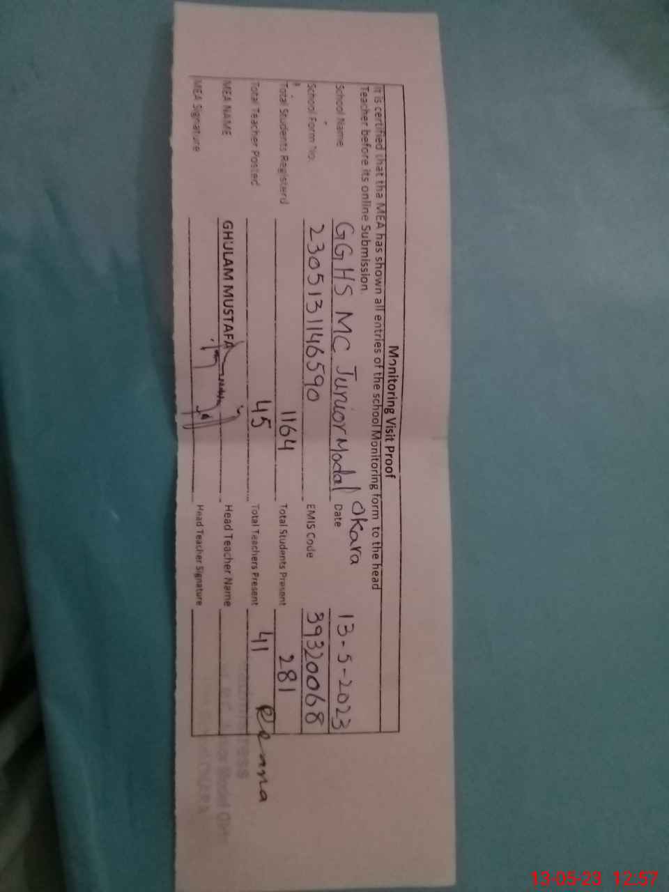 | EMIS Code: 39320068 | Name of School: GGHS MC JUNIOR MODEL OKARA | |||