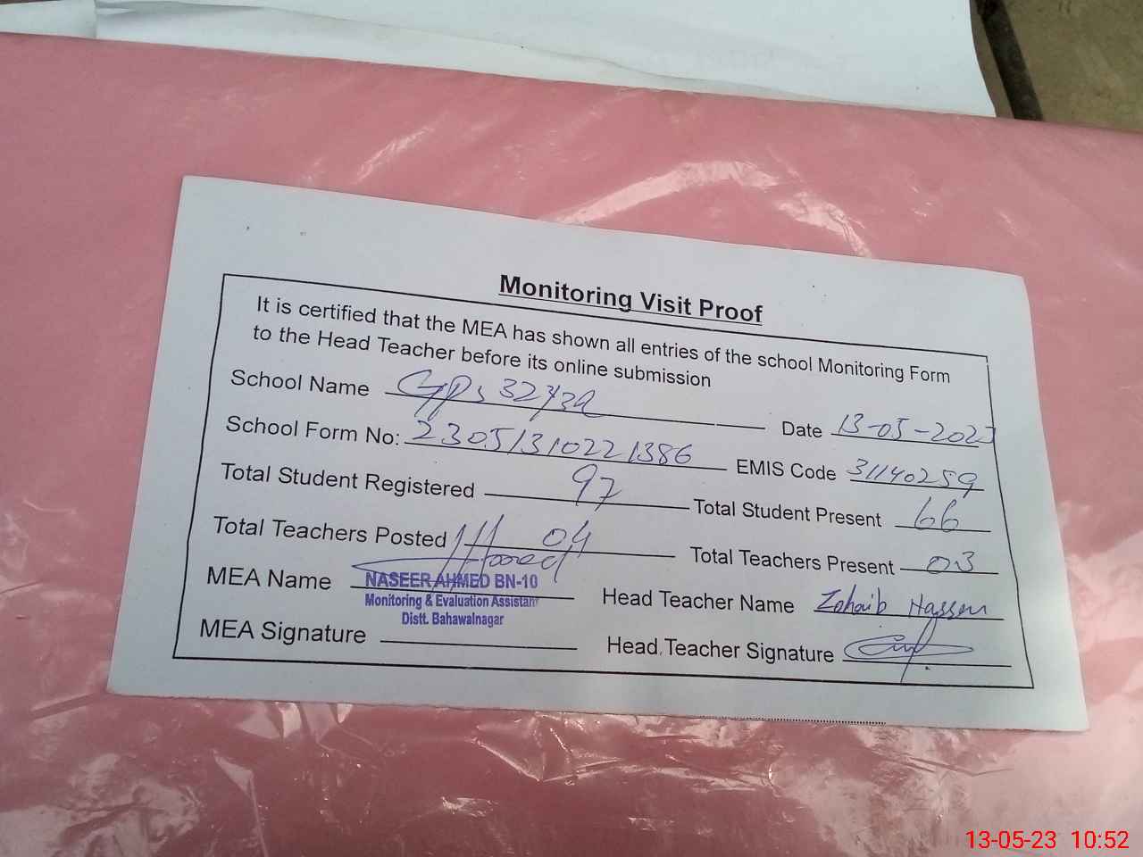 | Certified that this School was Inspected by the Undersigned MEA/DMO Today and the Information Stated Above is as Per Record. | |||||