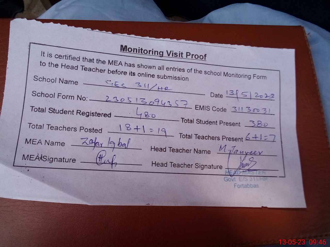 | Attendance Register | Head Teacher | MEA with School | Visit Proof |