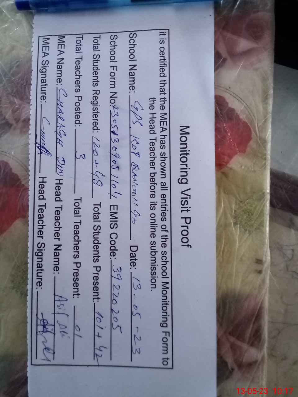 | EMIS Code: 39220205 | Name of School: GPS KOT QANOONGO P/O 22/E.B ARIF WALA | |||