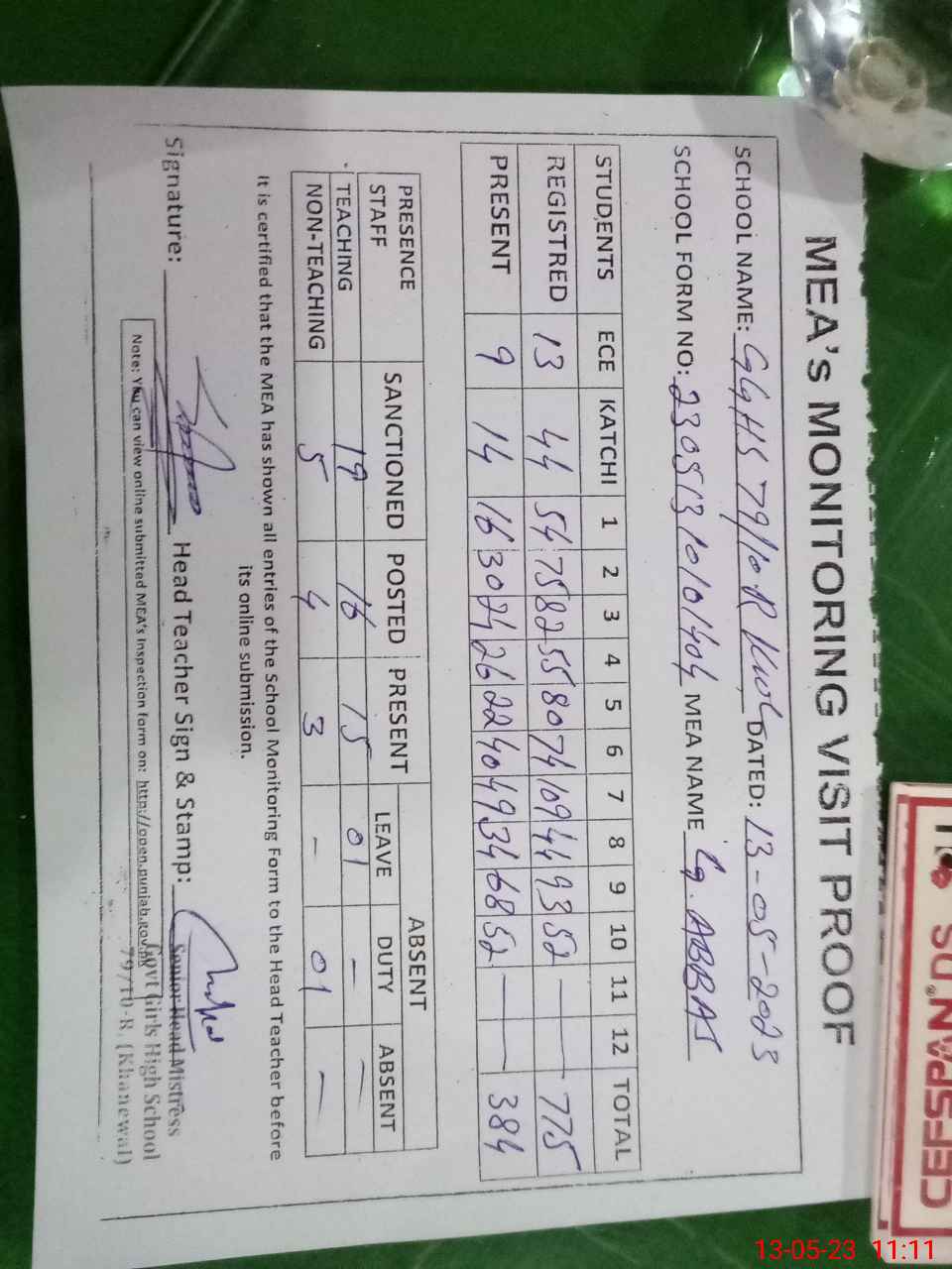 | Attendance Register | Head Teacher | MEA with School | Visit Proof |