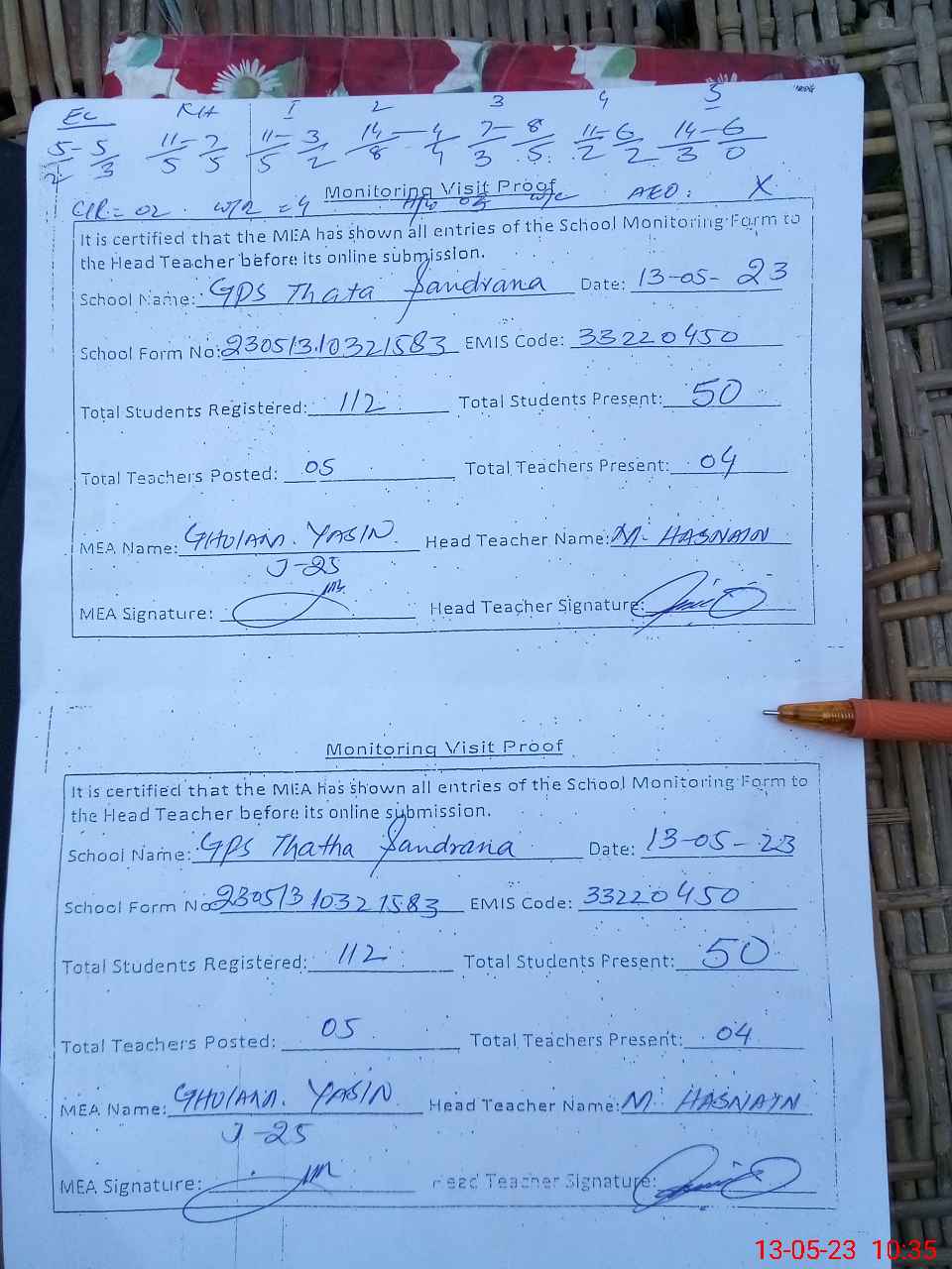 | Attendance Register | Head Teacher | MEA with School | Visit Proof |
