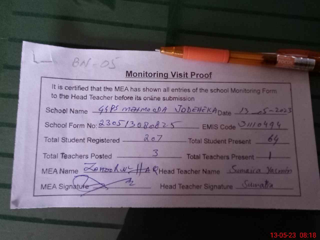 | Attendance Register | Head Teacher | MEA with School | Visit Proof |
