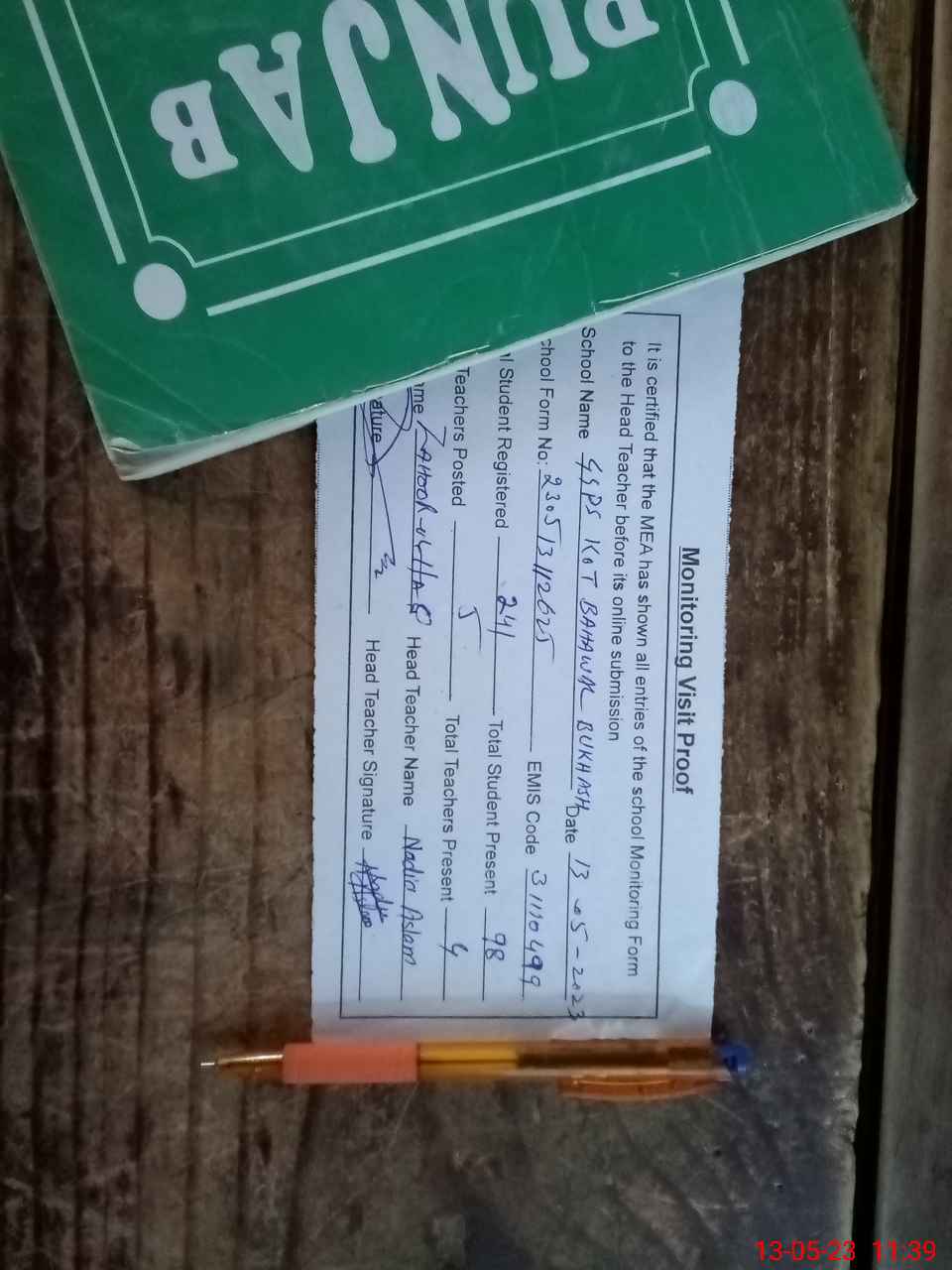 | Attendance Register | Head Teacher | MEA with School | Visit Proof |