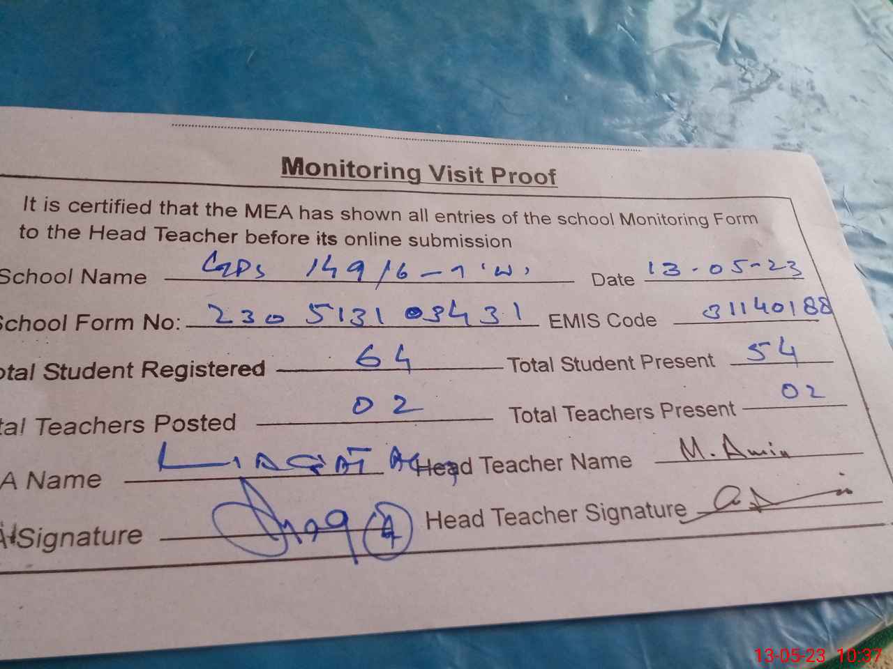 | Attendance Register | Head Teacher | MEA with School | Visit Proof |