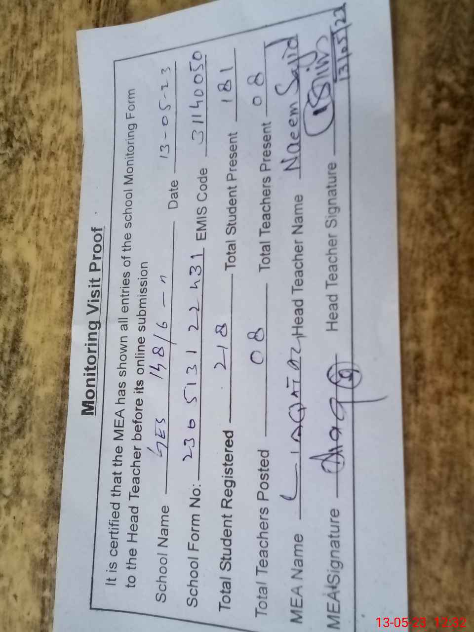 | Attendance Register | Head Teacher | MEA with School | Visit Proof |