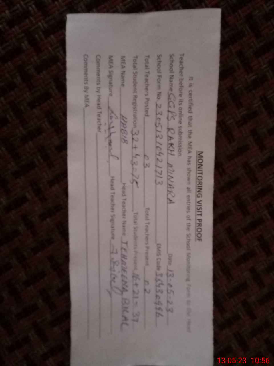 | Attendance Register | Head Teacher | MEA with School | Visit Proof |